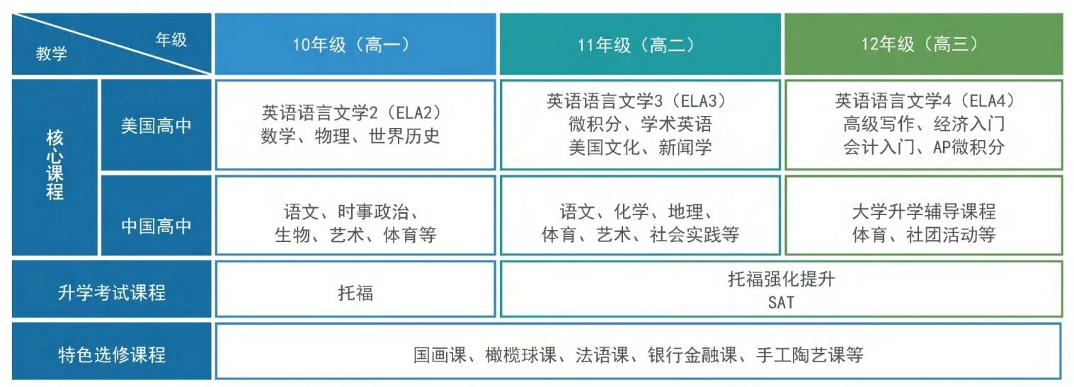 國際部課程將美國高中核心課程及國內高中課程與校本課程有機融合。美國高中課程由具備豐富教學經驗的歐美籍外教執教,國內高中課程由本校選派優秀的教師授課。標化課程、升學規劃及領導力創新活動課程由海外留學精英雙語老師進行執教。課程內容飽滿,幫助學生全面發展,學生申請海外名校時,擁有更大的競爭力。