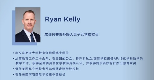 成都貝賽思的創校校長為Dr. Ryan Kelly,他是一名有著豐富教育經驗的領導者,從事教育工作二十多年,曾在美國的公立、特許和私立/國際學校擔任AP和IB化學和數學的教學工作,獲得全美委員會化學教師資格認證以及博伊西扶輪社杰出教育家獎。