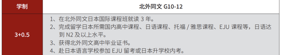 學 制 :北外同文完成 3 年高中學習,入讀北外日本國際本科項目(北外校內就讀1/1.5 年+赴日本大學就讀3年)