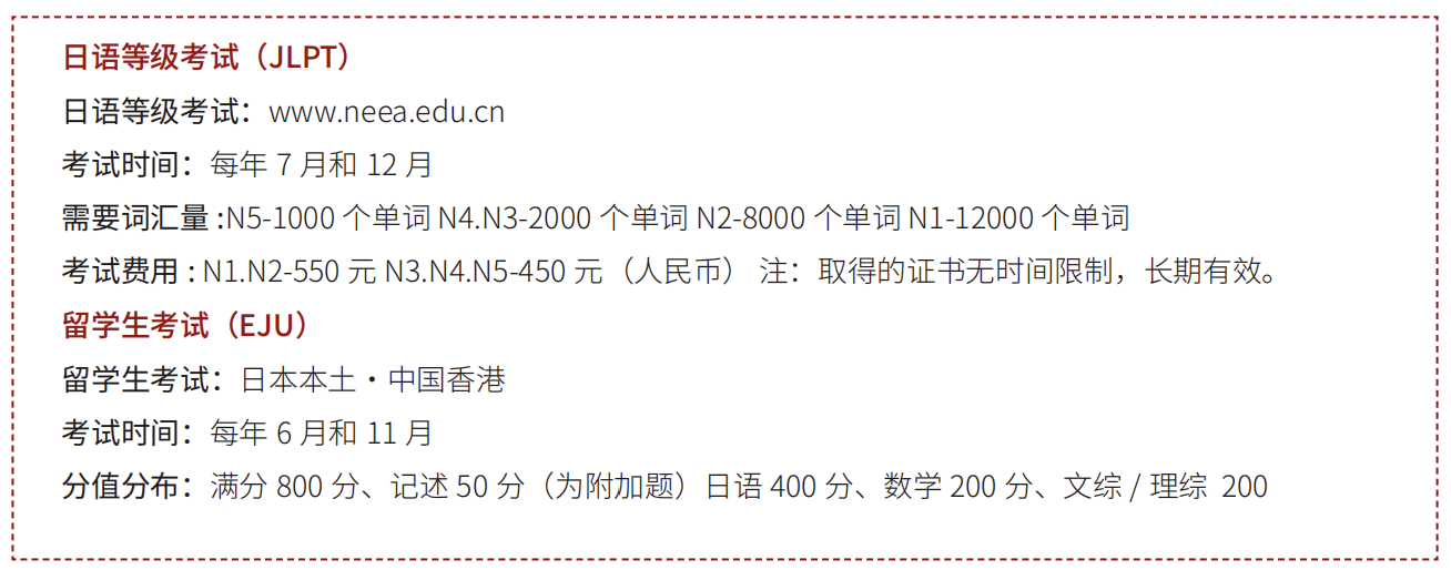 大多數國立大學和部分私立大學要求提交 EJU 成績。考試科目:日語、理科(物理、化學、生物)、數學(文科數學或理科數學)、綜合科目(文科)。