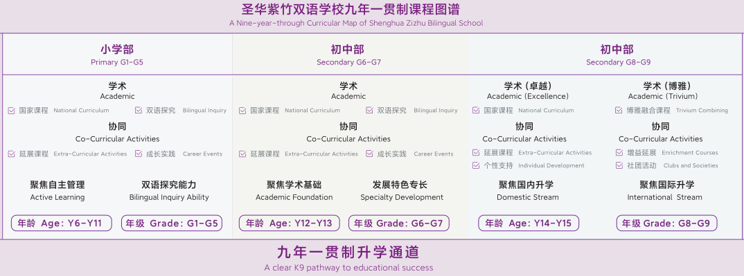 秉持“以學術為核心的全人教育”理念,發展中心縱向貫通1-9年級課程,深度融合優質資源,實現小初無縫銜接;橫向拓展200多門CCA課程,通過項目化探究學習,融合藝術、體育、科創等領域的興趣與專長培養。結合“院士專家進校園”、戈壁徒步、戶外探索、勞動實踐及海外訪學等項目,激發學生的學習興趣,拓展全球視野,培養自主探索能力與熱情,實現學術與特長的并行發展,助力每個孩子全面發展成為具有對話世界、解決全面問題能力的未來人才。