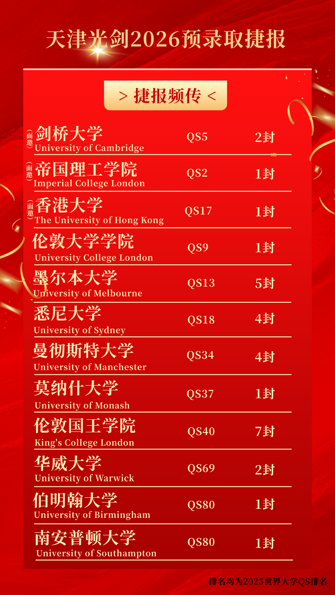 目前,海外院校錄取進程仍在有序推進,后續還有諸多 QS 世界排名前列的優質名校錄取機會值得期待。愿同學們堅守初心、從容應考,穩步推進后續申請事宜,與學校攜手并肩,靜候更多升學捷報,共同書寫屬于自己的璀璨升學華章。